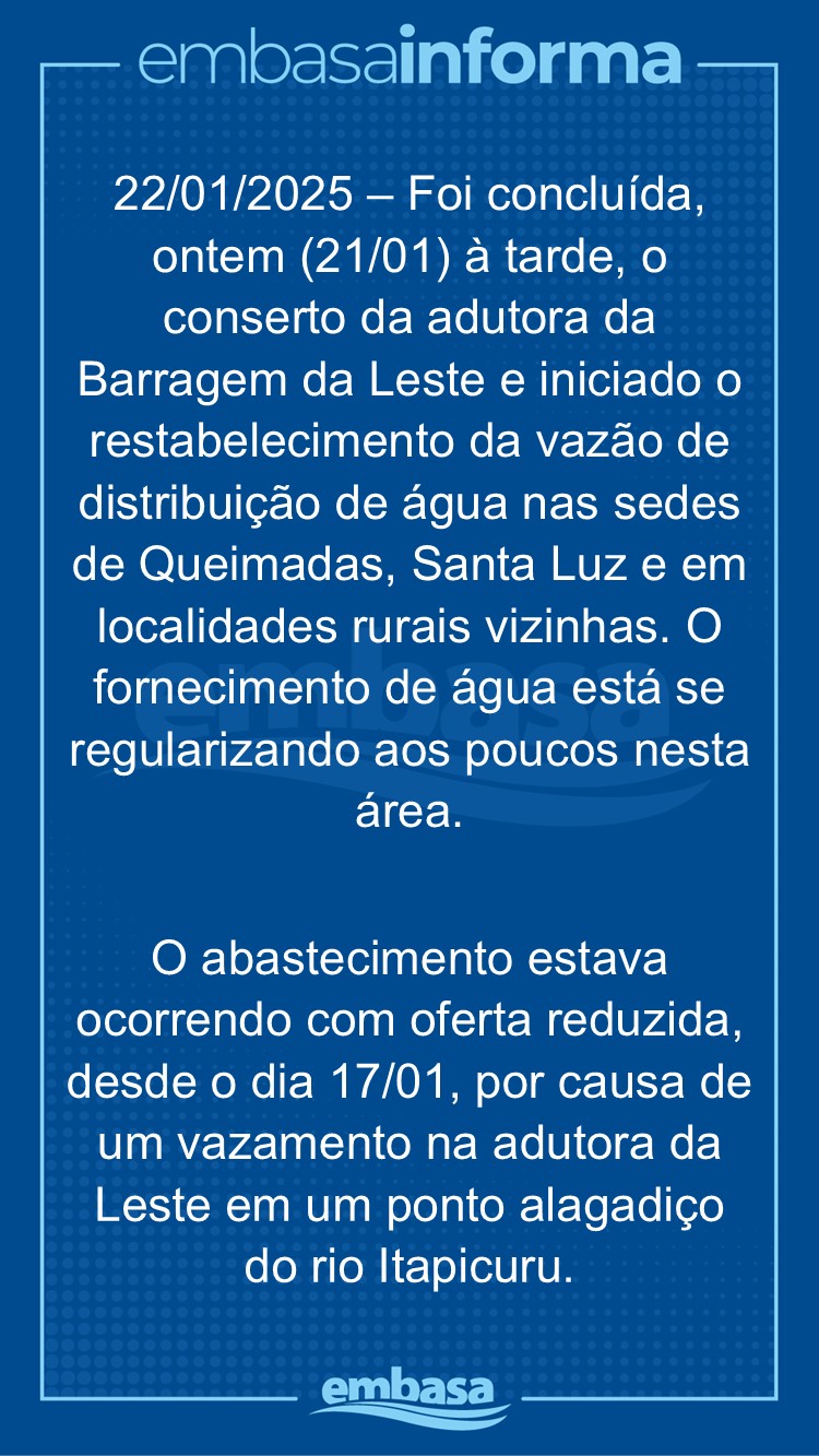 A Empresa Baiana de Águas e Saneamento (Embasa) confirmou nesta quarta-feira (22) que reestabeleceu a distribuição de água potável nos municípios de Santaluz e Queimadas, sertão do estado. Os moradores estão sem fornecimento há pelo menos 15 dias.