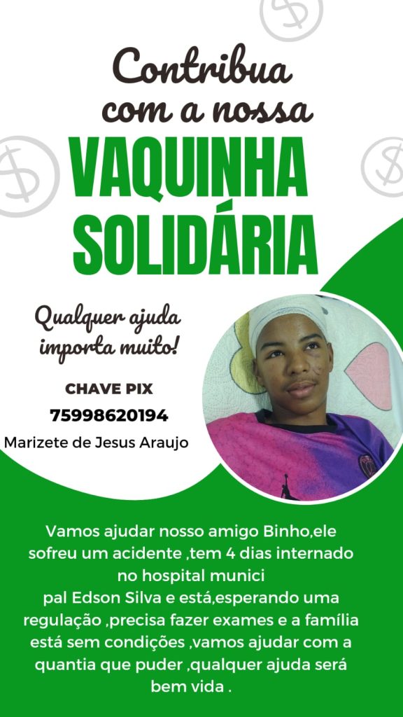 A família, inclusive, abriu uma “Vaquinha” nas redes sociais, para quem puder ajudar com os custos de saúde. Quem puder ajudar, o PIX é (75) 99862-0194 (Marizete de Jesus Araújo).