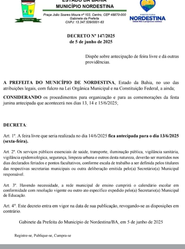 A feira livre de Nordestina do sábado (14/6) será antecipada para a sexta-feira anterior. A novidade foi confirmada por meio de decreto, assinado pela prefeita Eliete Andrade (PSD) na última quinta-feira (5).