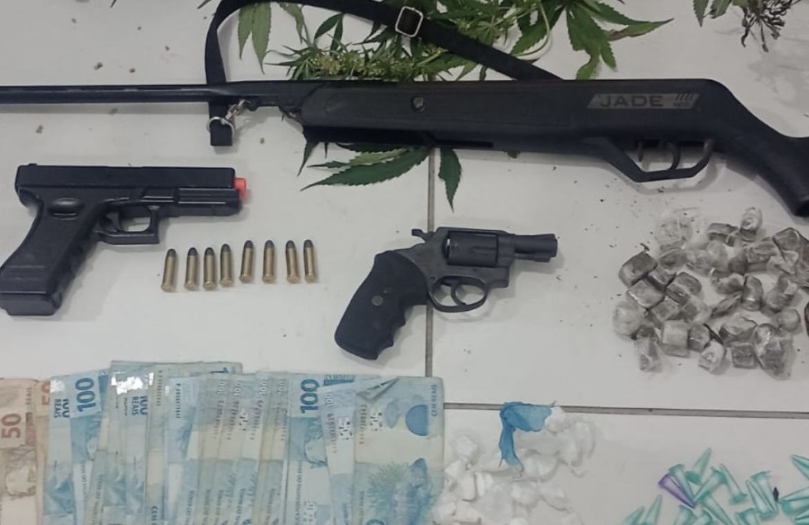 Na residência do investigado, também situada na zona rural do município, foram apreendidos um revólver, uma espingarda de pressão, um simulacro de pistola, 157 porções de cocaína, 32 de maconha, quatro celulares, uma motocicleta e uma quantia em dinheiro. No local, ainda foram encontrados dois pés de maconha plantados no terreno do imóvel.