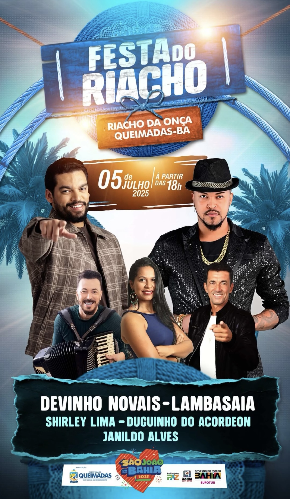 Além da apresentação de Devinho Novaes (patrocinado pela SUFOTUR/Gov. do Estado), a Prefeitura confirmou que a intitulada “Festa do Riacho” contará com outras atrações como: Lambasaia, Shirley Lima, Duguinho do Acordeon e Janildo Alves. A festa está programada para começar às 18h deste sábado (05/07).