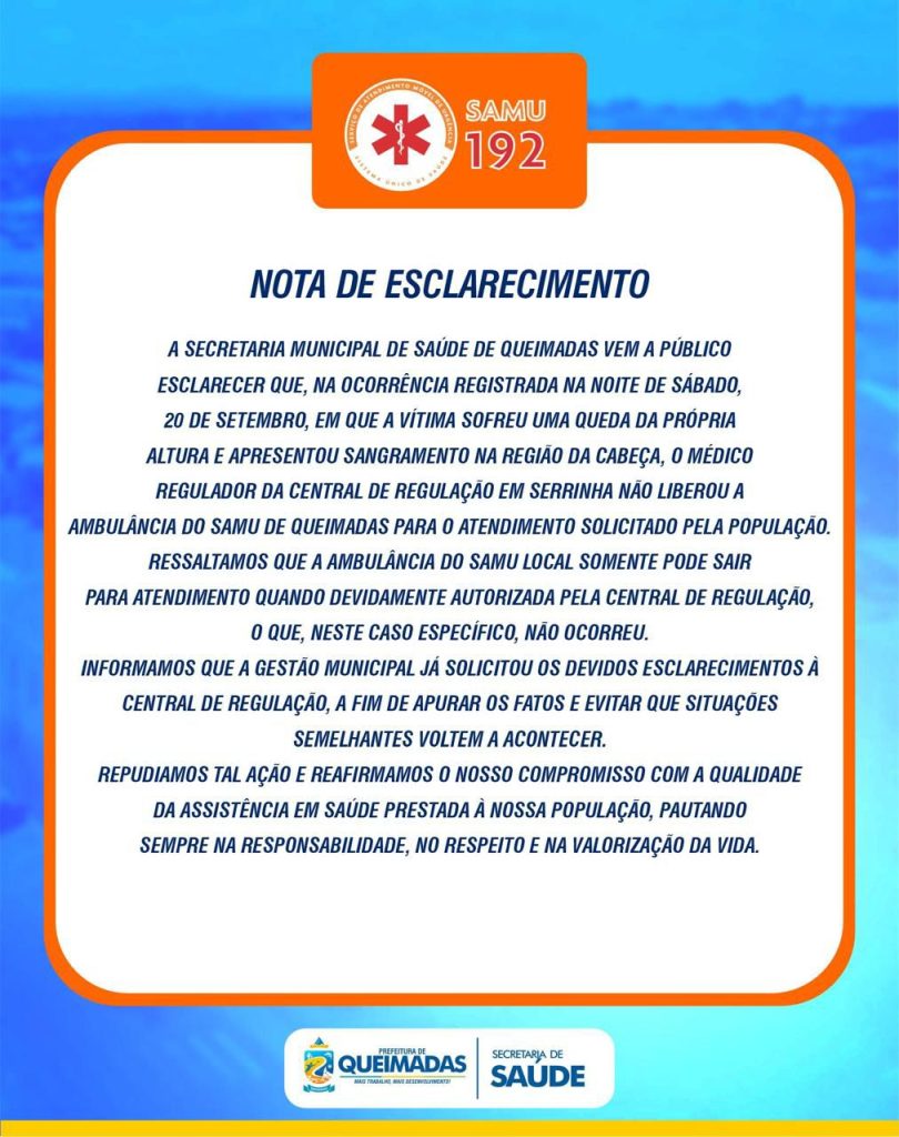 “Ressaltamos que a ambulância do SAMU local só pode sair para atendimento quando devidamente autorizada pela regulação, o que, neste caso específico, não ocorreu”, pontuou a Prefeitura de Queimadas.