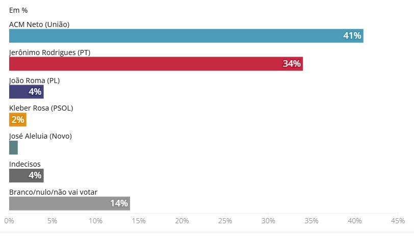 De acordo com o levantamento, ACM Neto pontuou 41% das intenções de voto, contra 34% de Jerônimo. João Roma (PL) chegou aos 4%, contra 2% de Kleber Rosa (PSOL). José Aleluia, do Novo, chegou a 1%. Indecisos somam 4%. Brancos/nulos/não vão votar foram 14%.