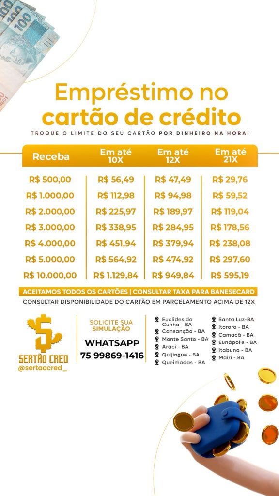 Quem tiver dúvidas ou quiser o empréstimo pode entrar em contato pelo WhatsApp (75) 99896-1416. CLIQUE AQUI, acesse o Instagram e saiba como consultar.