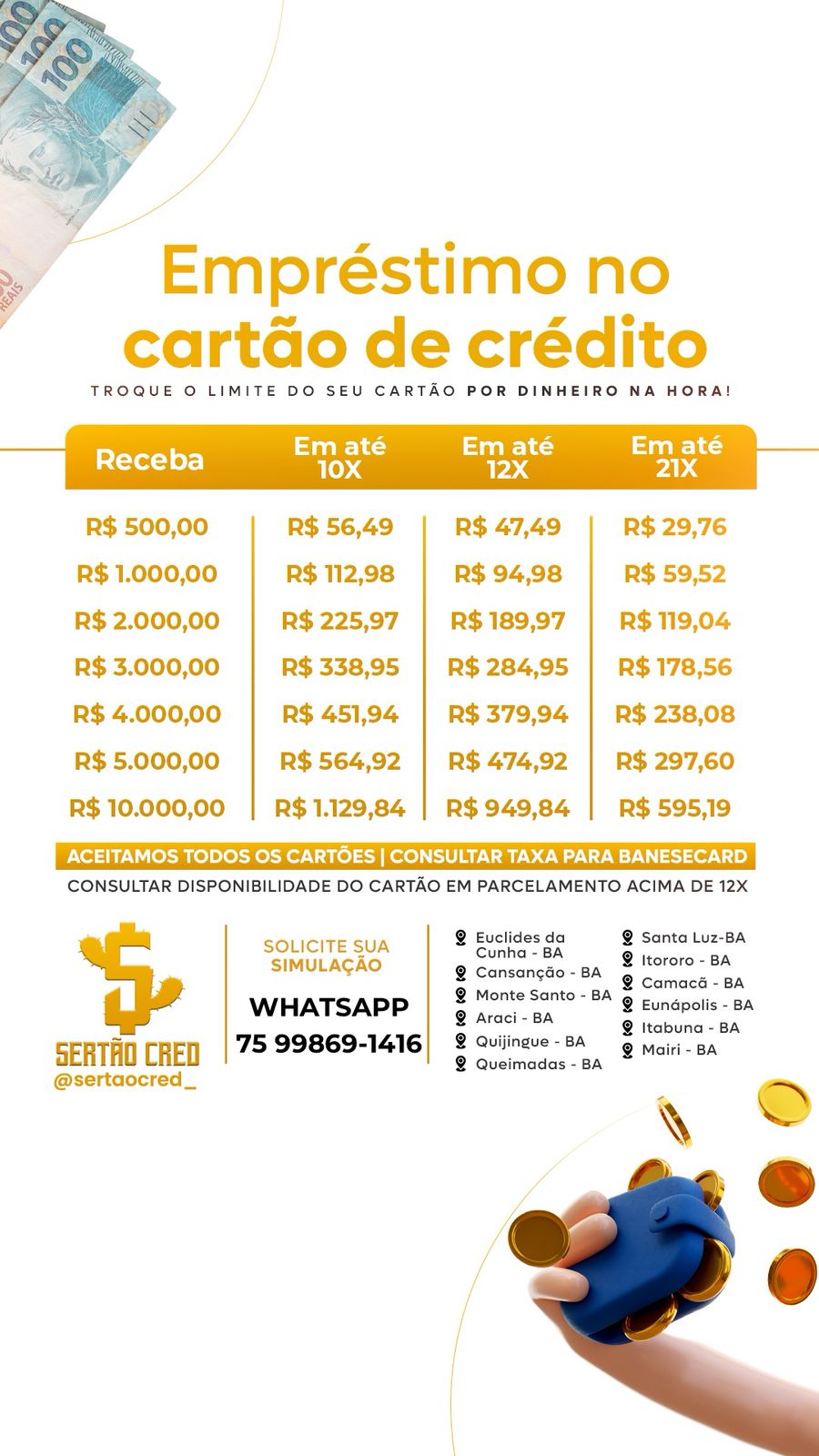 Quem tiver dúvidas ou quiser o empréstimo pode entrar em contato pelo WhatsApp (75) 99896-1416. CLIQUE AQUI, acesse o Instagram e saiba como consultar.