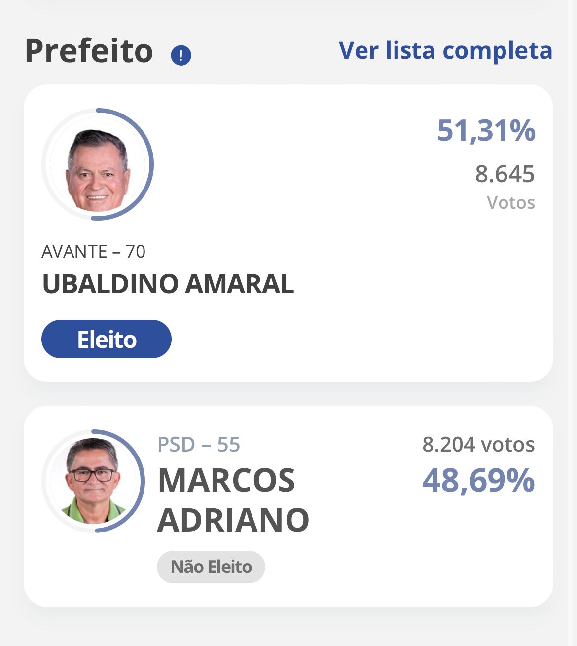 O prefeito Ubaldino Amaral (Avante) foi reeleito prefeito de Valente, neste domingo (6), garantindo sua vitória com 52,32% votos válidos. Ele derrotou seu adversário, Marcos Adriano (PSD), que obteve apenas 48,69%.