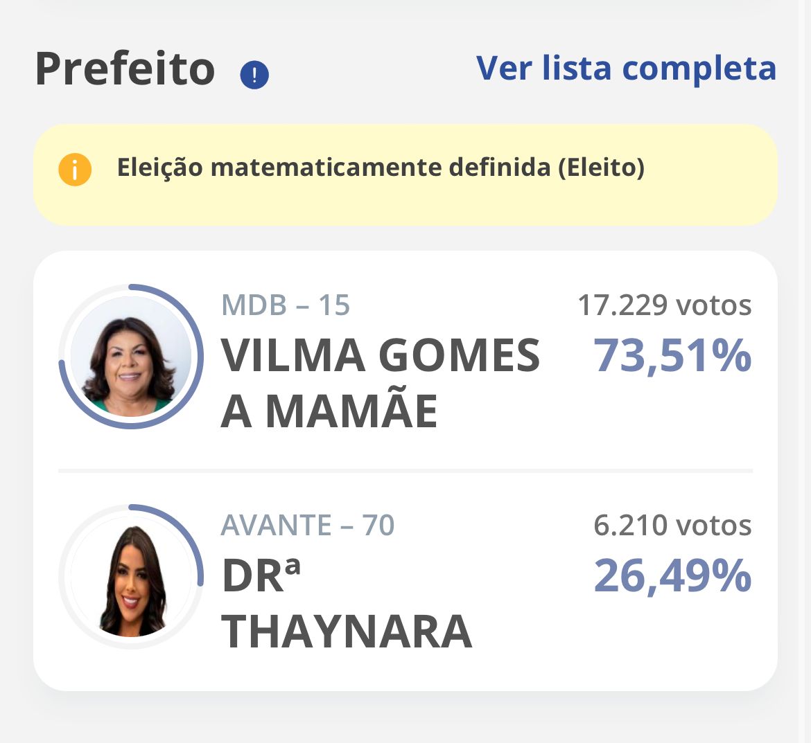 Neste domingo (6), Vilma Gomes (MDB) foi reeleita prefeita de Cansanção, com 73,51% dos votos válidos. Ela derrotou sua adversária, Dra. Thaynara, que teve 26,49%