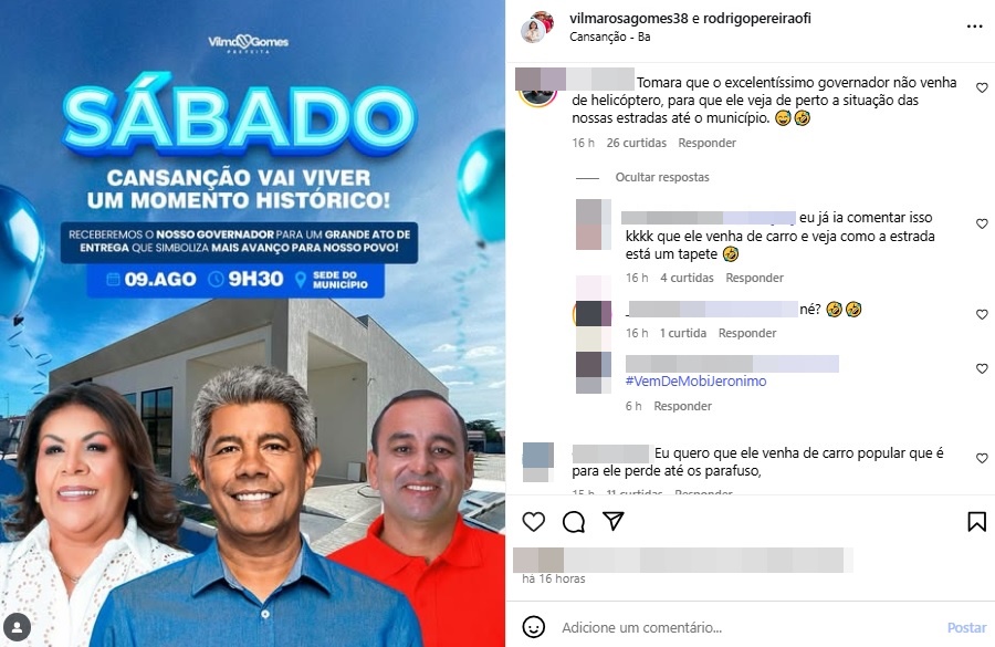 A visita do governador ao município de Cansanção está programada para este sábado (9). As sugestões para Jerônimo chegar de carro foram feitas na publicação, no Instagram, da prefeita Vilma Gomes (MDB), que confirma a presença do petista.