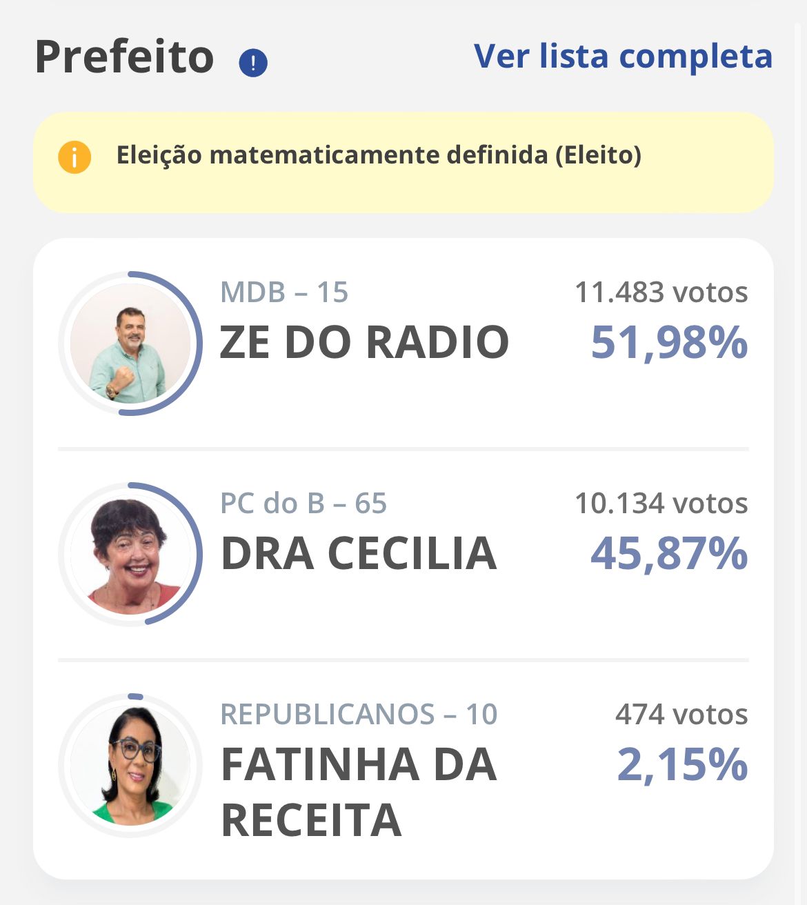 O prefeito Zé do Rádio (MDB) foi reeleito prefeito de Itiúba nas eleições deste domingo (6), obtendo 51,97% votos válidos. Ele superou Dra. Célia Petrina e Fatinha da Receita.